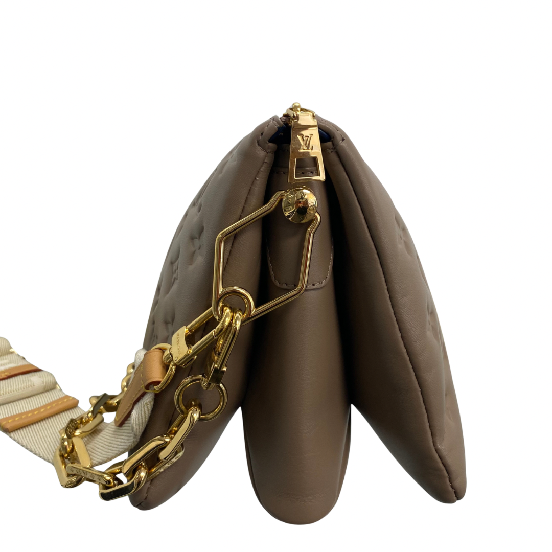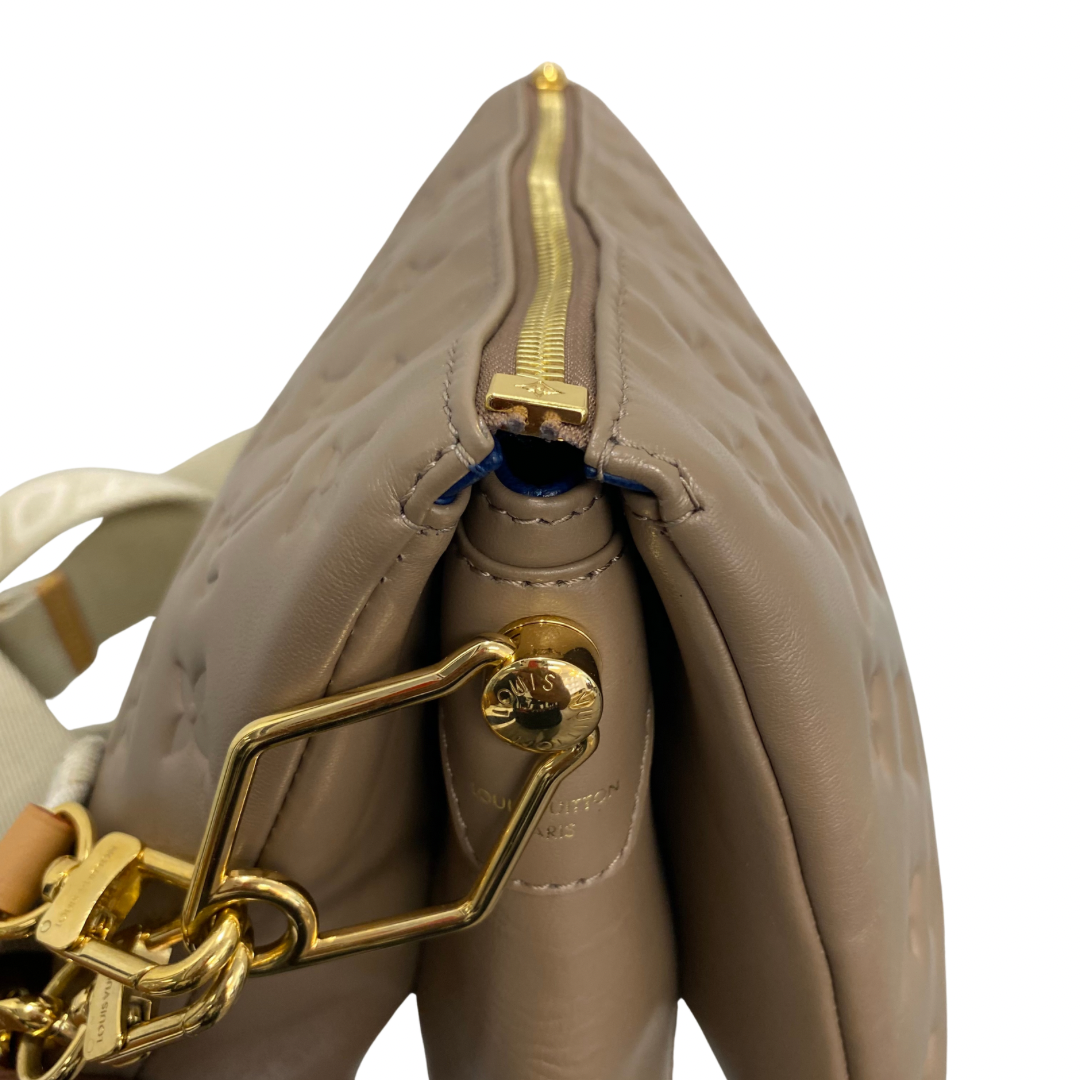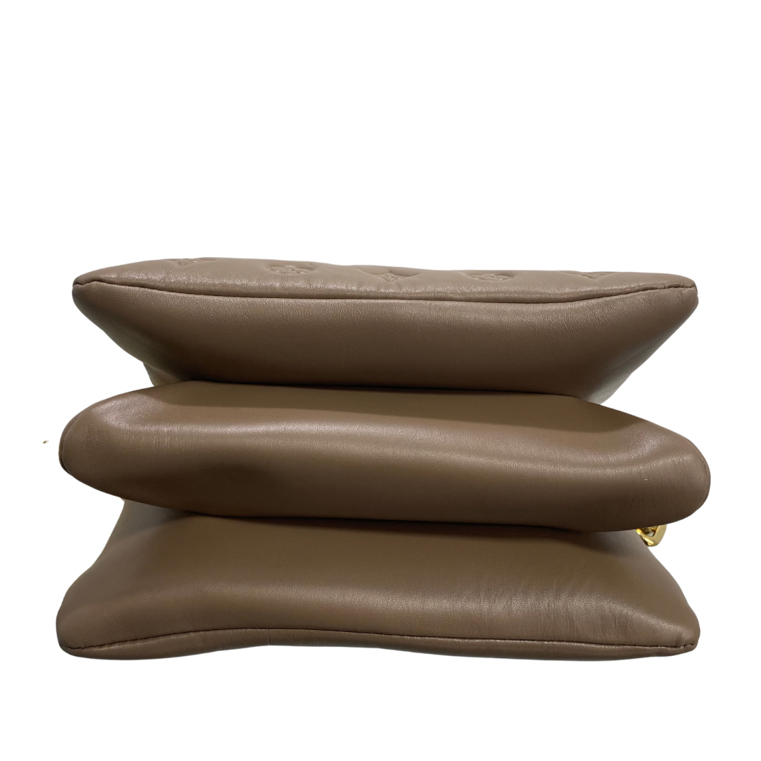 Style: Taupe Monogram Embossed Puffy Lambskin "Coussin PM" Crossbody W/Compartments |